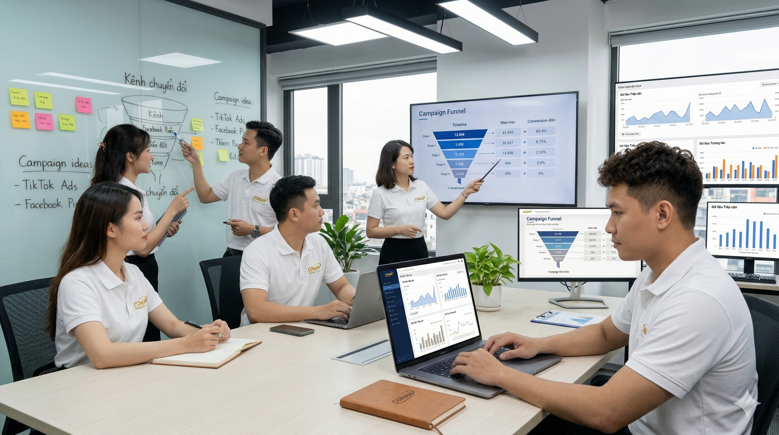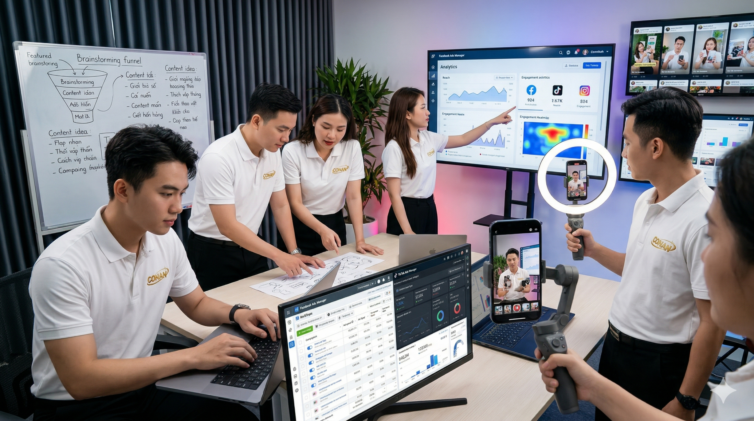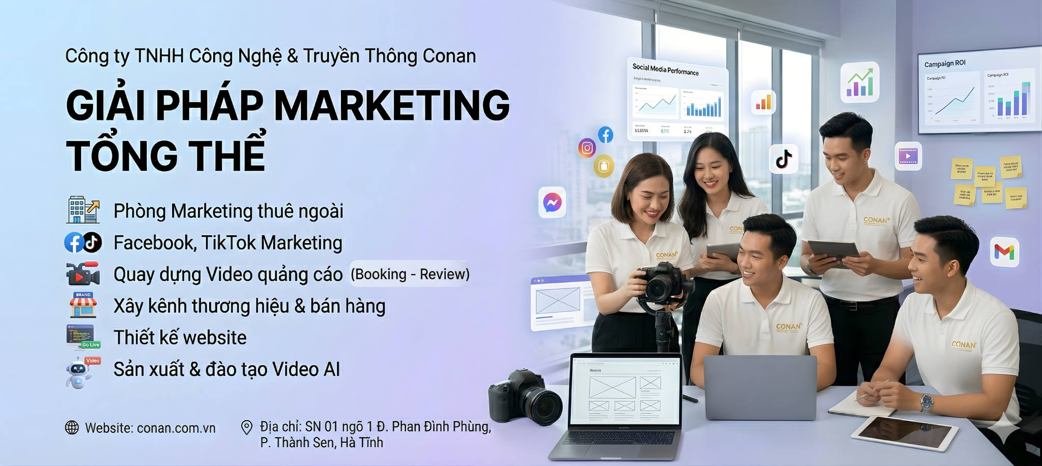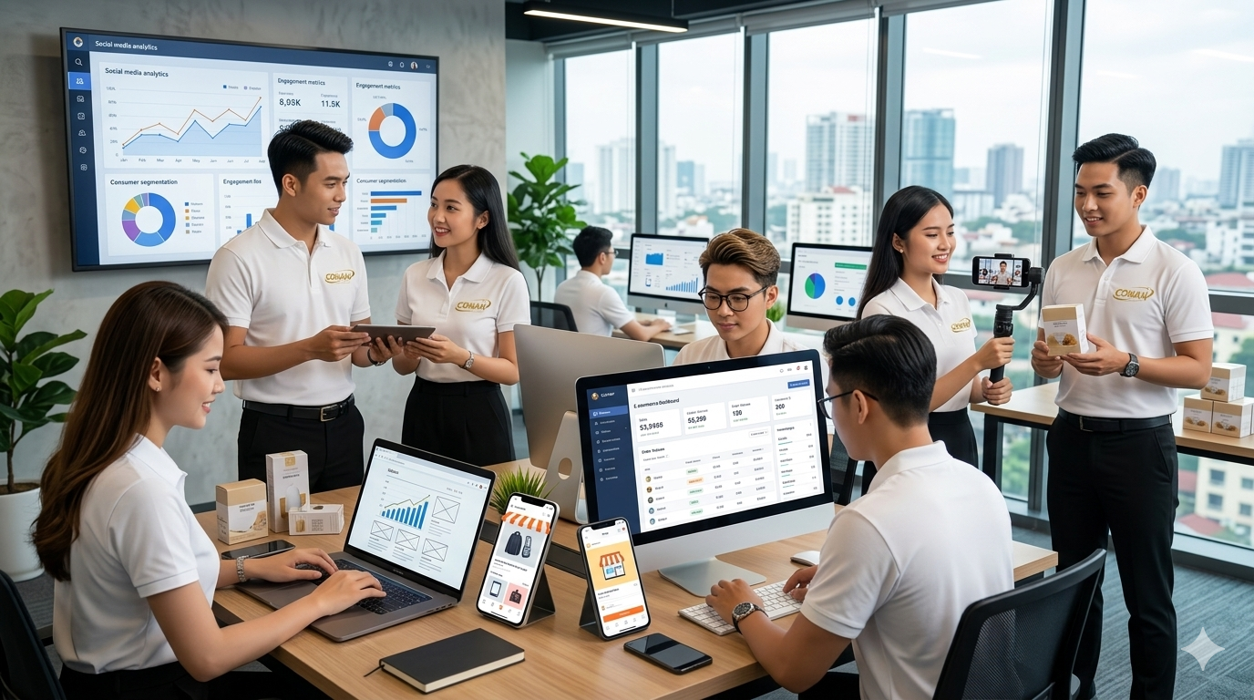 Với đội ngũ trẻ trung, sáng tạo và am hiểu thị trường, Conan tập trung triển khai các dịch vụ cốt lõi như: Marketing thuê ngoài, quảng cáo Facebook & TikTok, sản xuất video quảng cáo, xây dựng kênh bán hàng và thiết kế website.